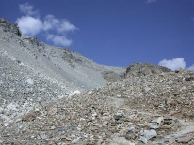 den ganzen Pass bedeckt hat. Die ganze Stein-Landschaft ist Zeuge des Gletschers der
