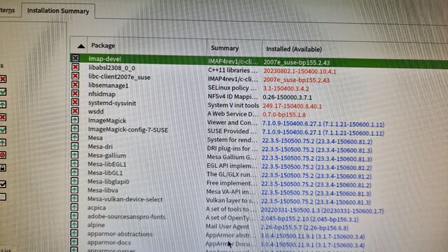 - Apache und PHP nicht mehr gestartet -> imap-devel hat gefehlt (war in der Liste der gelöschten Packages dabei) => https://software.opensuse.org/download/package?package=imap&project=network%3Atelephony manuell nachinstalliert